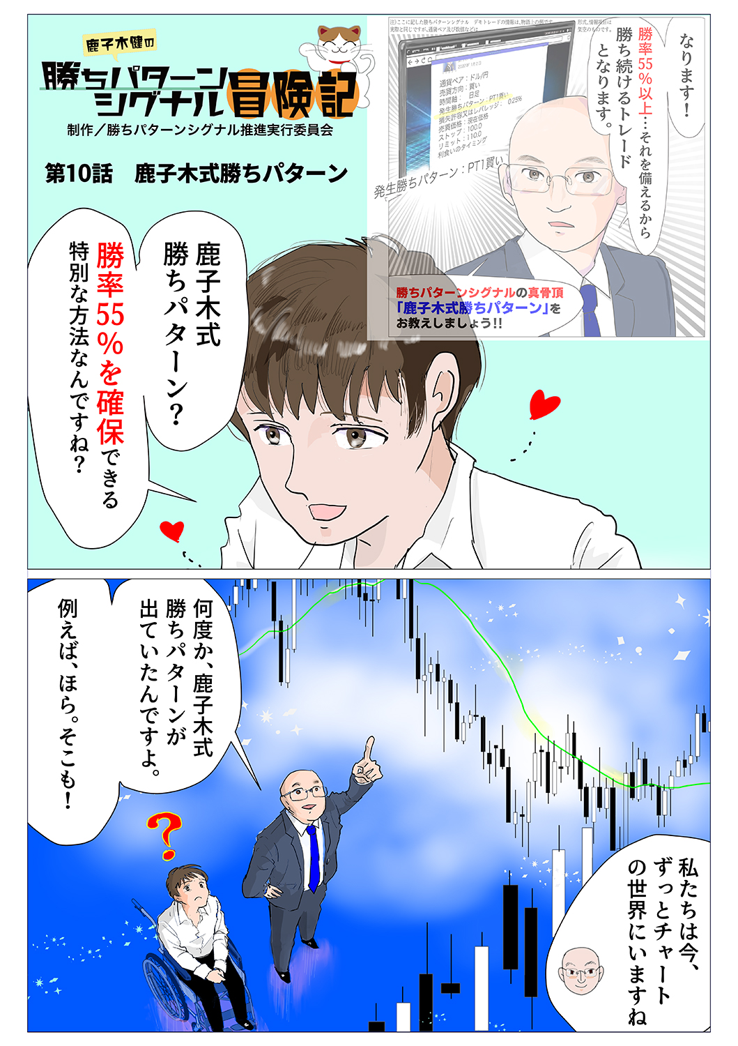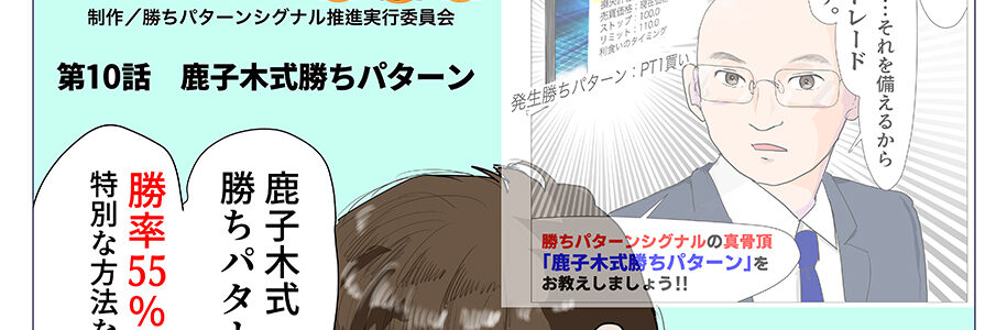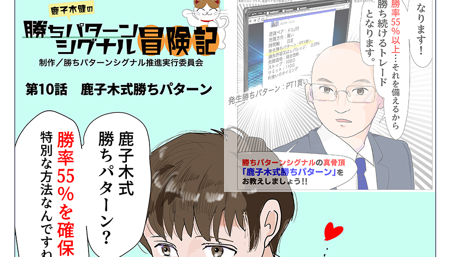 ※上記作品の表現の一部に「勝率55%を確保」との表現がありますが、そちらは現在(2022.2.4時点)の鹿子木健の勝ちパターンシグナルサービス内で行っておりますモデルトレードの勝率が「59.53%」でありそちらの勝率を用いての表現となっております。将来の運用成果を約束するものではございません。